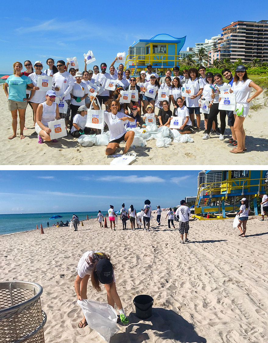 Vrijwilligers van de Stichting De Weg naar een Gelukkig Leven Miami sloten zich bij andere plaatselijke vrijwilligersgroepen aan om het strand schoon te maken met de boodschap van de Wereldmilieudag van dit jaar: wordt de plasticvervuiling de baas.